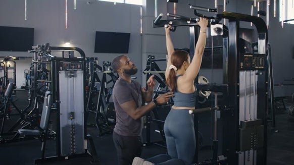 For the final move in the routine, Ben does a regular chest press movement. The trainer uses a chest press machine to focus on pressing and to avoid having to worry about the weight.
