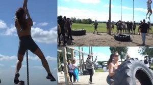 First up was the rope climb. It was absolutely grueling on their hands, and Lucy even lost a nail. That was quickly followed by box rolls, which is exactly how it sounds: rolling a box across a field. Then tire pulls, more rope climbs, more tire pulls, tire toss, and burpees with an added obstacle. Lucy was exhausted. Considering she’s an ultramarathon runner, it must have been a serious workout.