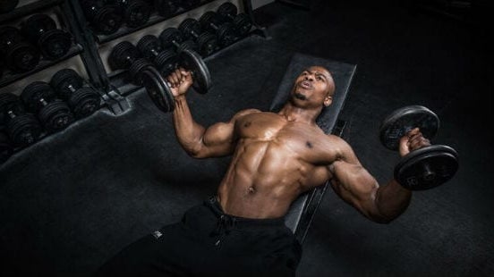 - Grab a dumbbell in both hands and begin with the dumbbells resting at shoulder height with your elbows out to your sides