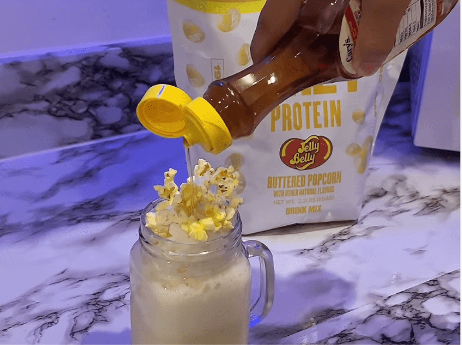 Blend your milk, whey protein, and sugar-free syrup together. Add whipped cream and a handful of popcorn on top and enjoy!