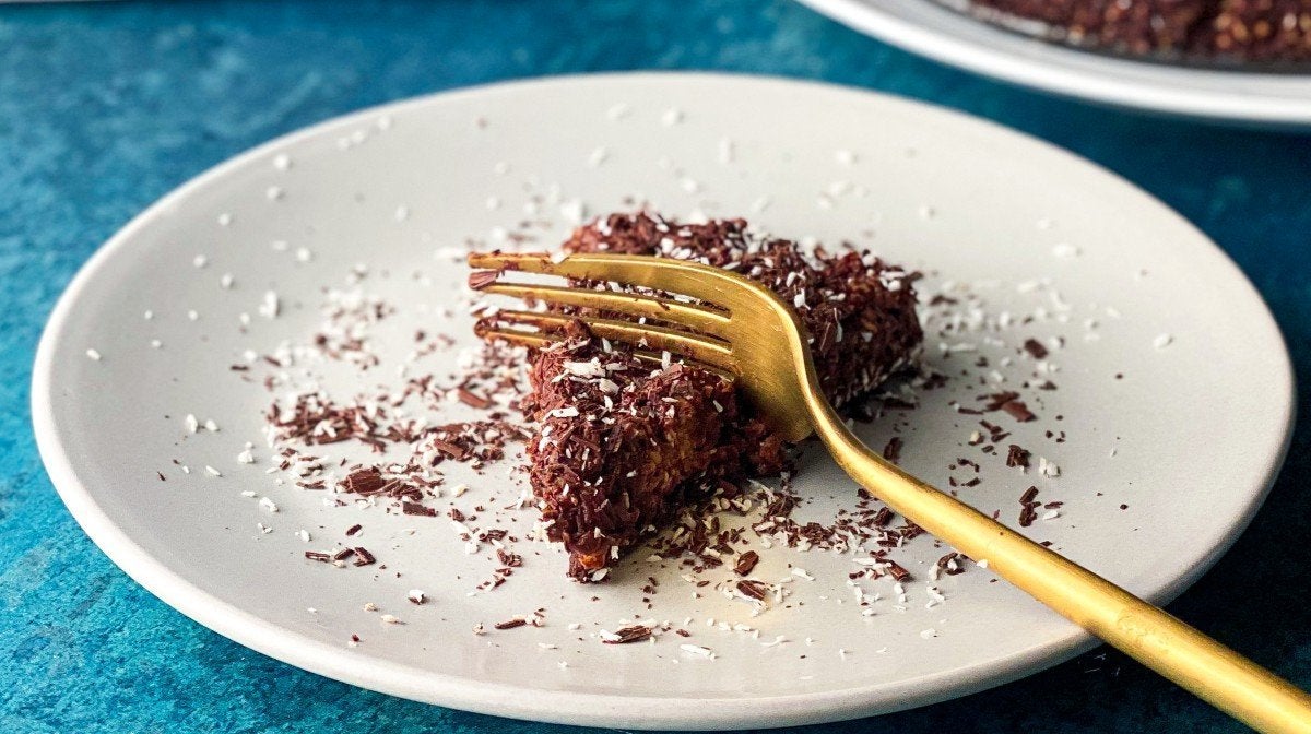 Once ready to serve, sprinkle with desiccated coconut and dark chocolate shavings for an extra finishing touch and then cut into slices. This also goes perfectly with your favourite fresh berries or slices of banana.