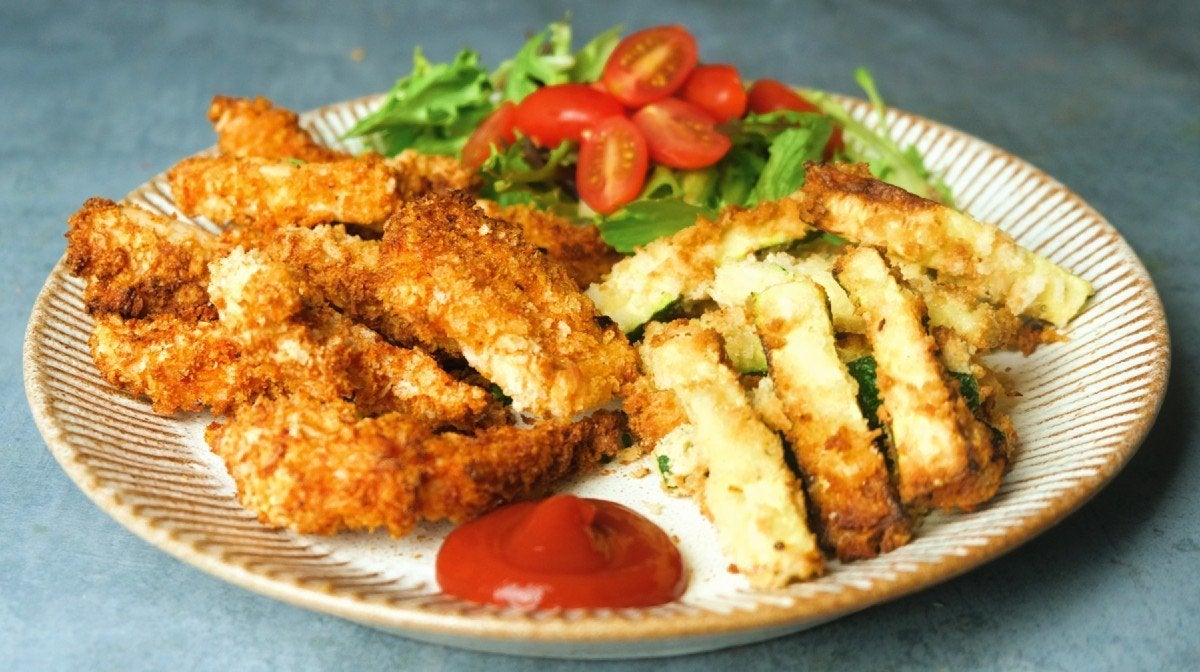 4) For the courgette fries, prepare cornflour, egg and seasoned panko breadcrumbs just like you did for the chicken. Dip each strip of courgette into the cornflour, then egg, then breadcrumbs.