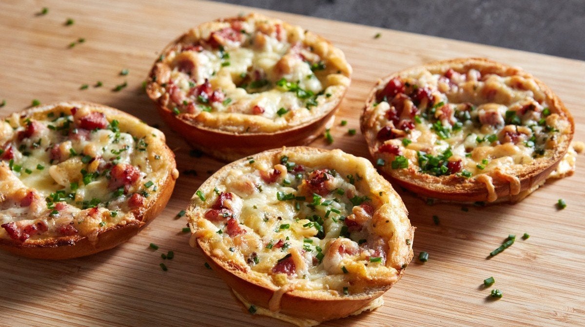 - Fry up your bacon pieces until cooked through and slightly crispy. Spoon them into the hollowed bagel halves, making sure to distribute evenly.