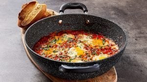 Shakshuka is a traditional Mediterranean dish of eggs poached in a rich sauce of tomatoes, olive oil, peppers, onion, and garlic. We think it’s an absolute winner for any meal of the day – whether you’re tucking in with a slice of crusty bread at brunch, or serving up with a side salad for dinner.