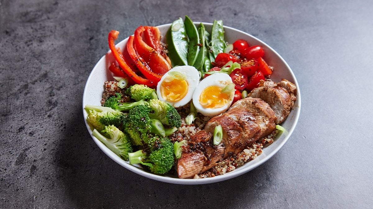 - Build your protein bowl. Make a quinoa base, then add the cooked broccoli and snow peas, along with slices of red pepper and cherry tomatoes. Add the sliced chicken breast and boiled egg (remove the shell first!), then add the remaining marinade that you kept aside and garnish with chopped spring onion.