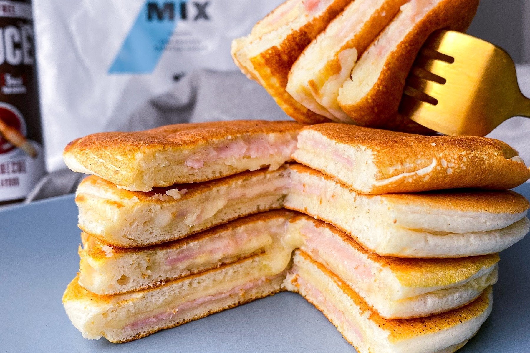 In a bowl, add the Protein Pancake Mix and then gradually add the milk bit by bit until the batter leaves a trail. - Pour around 2 tablespoons of the batter into a hot pan, add the ham and cheese slices on top and then seal with another tablespoon of pancake mix. Cook for 1-2 minutes and then flip.
