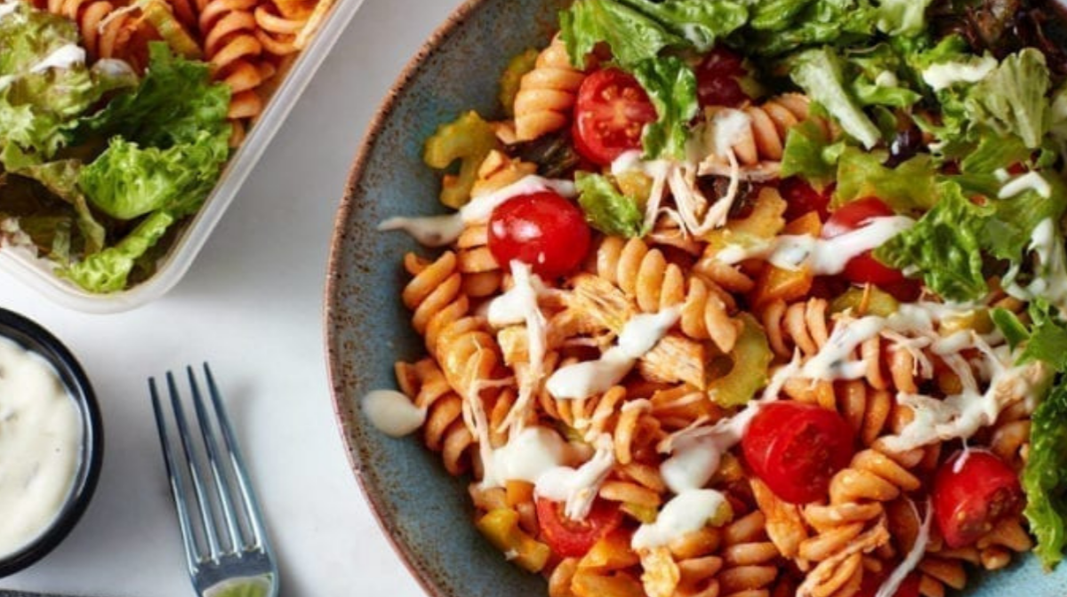 3. Pour over buffalo sauce and toss it through the pasta salad. Divide amongst 3 meal-prep containers, drizzle a little ranch dressing over each, and serve with a handful of mixed leaves or your favorite side salad. Refrigerate for up to 3 days and enjoy hot or cold.