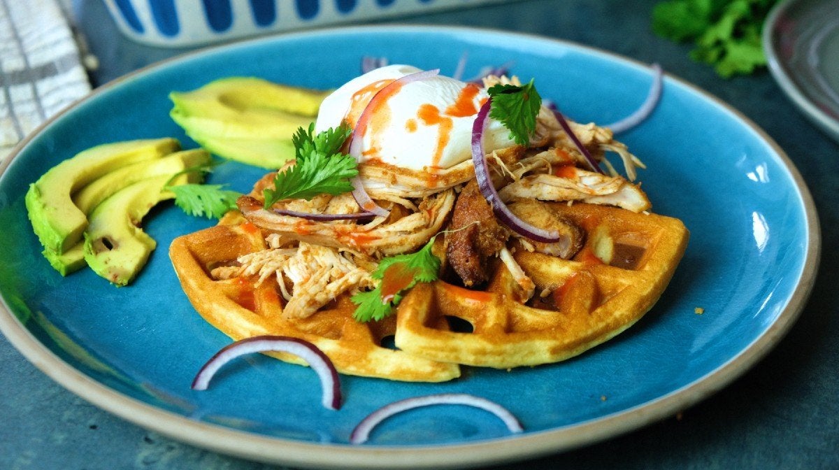 - To serve, place your waffle on a plate, followed by your shredded chicken, then add a poached egg on top and avocado on the side. Garnish with red onion slices, coriander and hot sauce. Now that’s what we call breakfast.
