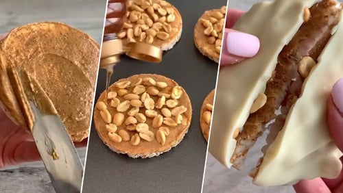 Rice cakes are quickly becoming the snack of the summer. First, people on TikTok covered them in spread, which obviously we had to jump on too. And now people are crushing them up into small pieces and covering them with all sorts of sweet goodness. And in this case the goodness is peanut butter and chocolate.