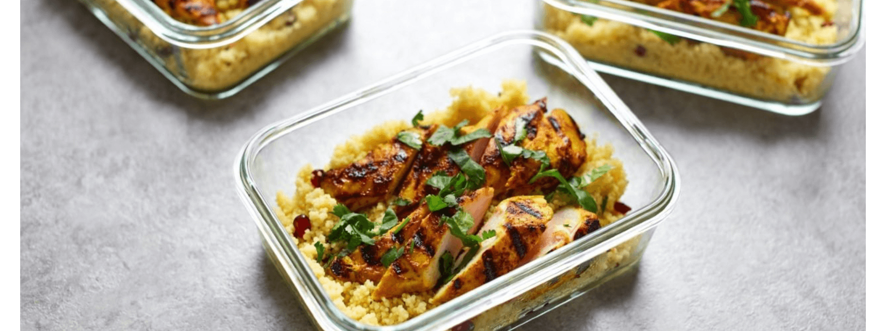 6) Finally, divide your couscous into 4 containers, top with two pieces of marinated chicken and finish with a sprinkle of coriander.