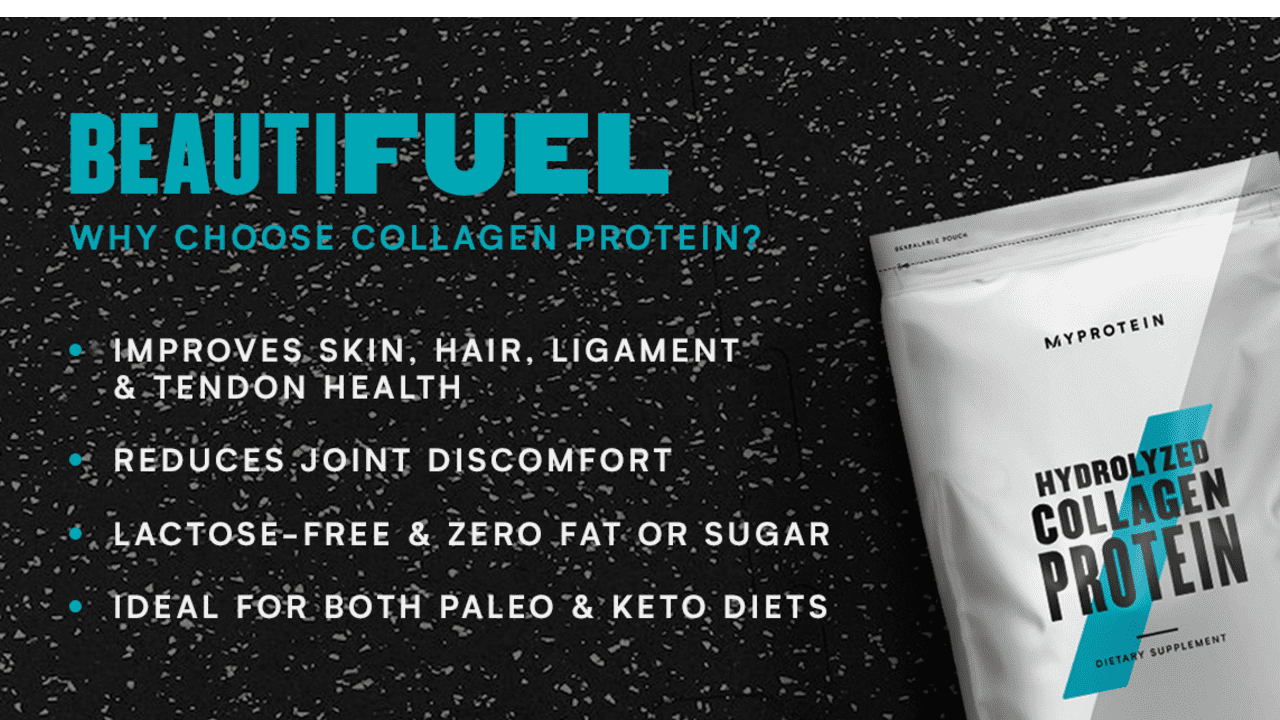 Myprotein’s Hydrolyzed Collagen has 18g of protein per serving and is sourced from bovine collagen peptides. Hydrolyzed collagen peptides are “pre-digested” and broken down into smaller chains that are more easily absorbed by the body.”