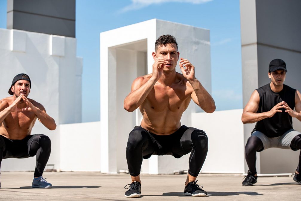 - Perform a standing bodyweight squat and hold your hands behind your head throughout.