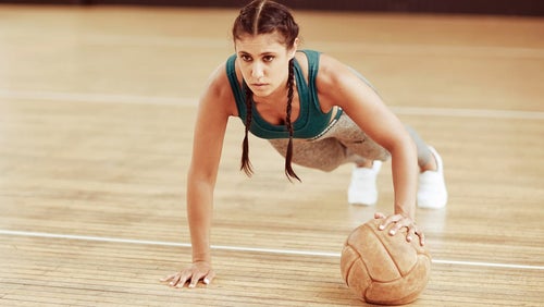 - With a quick, explosive movement, exhale and slam the ball down in front of your feet.